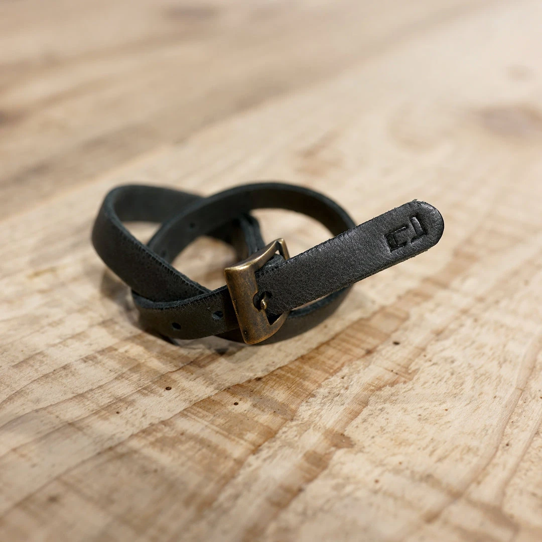 Leather belt in graphite with a slight change. Up until now, we included a loop that comes with the belt which looked fine when we first released it back in 2015.