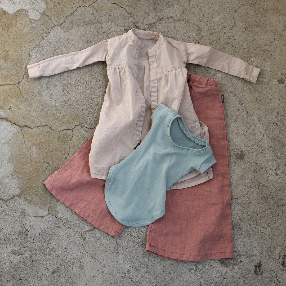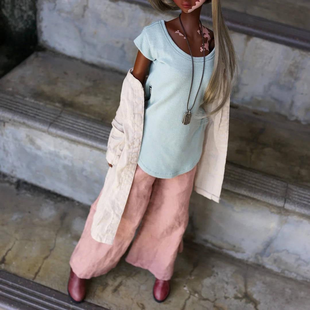 The outer shirt and wide flare bottoms have gone through a weathering and bio wash to give them a soft natural wrinkly look. While the three items look great together, the baggy T-shirt looks great on its own with a pair of panties when lounging around at home or with a pair of jeans.